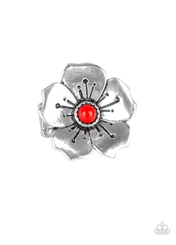 A bright red bead is pressed into the center of a blooming silver flower radiating with antiqued details for a whimsical look. Features a stretchy band for a flexible fit.