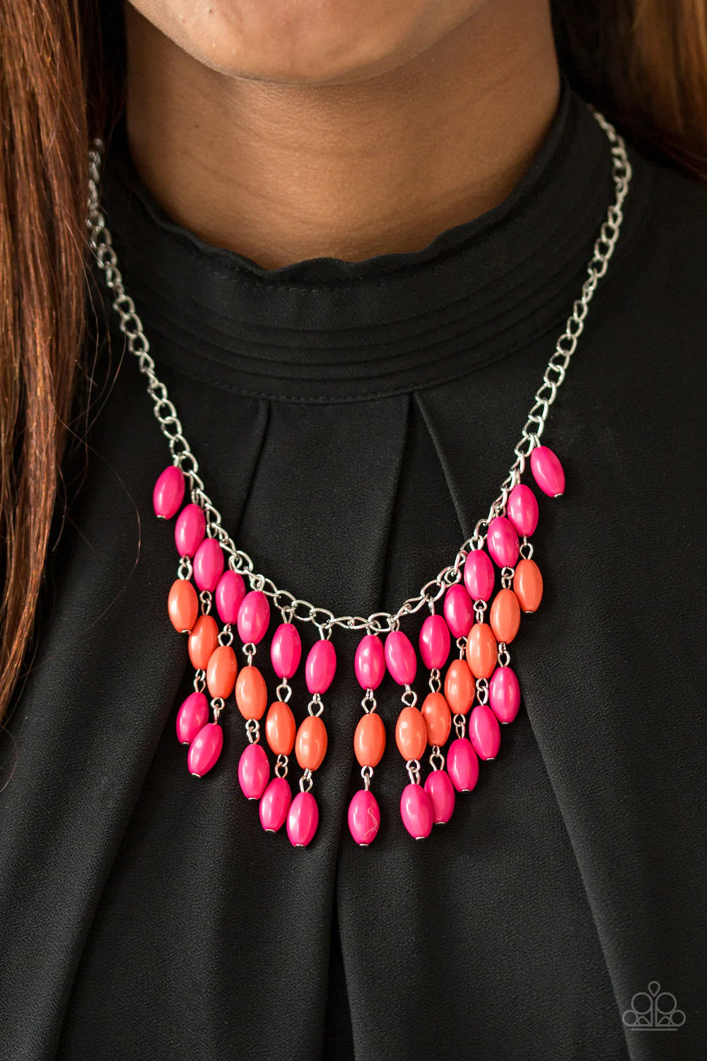 Faceted pink and orange beads cascade from the bottom of a shimmery silver chain, creating a flirty fringe below the collar. Features an adjustable clasp closure.