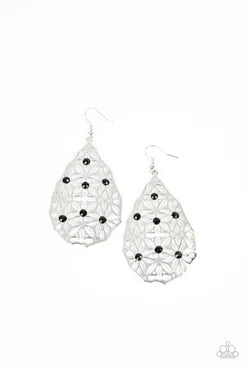 Shiny black beads are scattered across a teardrop frame filled with abstract floral filigree creating a whimsical lure. Earring attaches to a standard fishhook fitting.