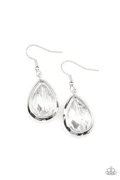Featuring a reflective metallic back, a glittery rhinestone gem is threaded along a rod inside a silver teardrop casing, creating a glamorous lure. Earring attaches to a standard fishhook fitting.