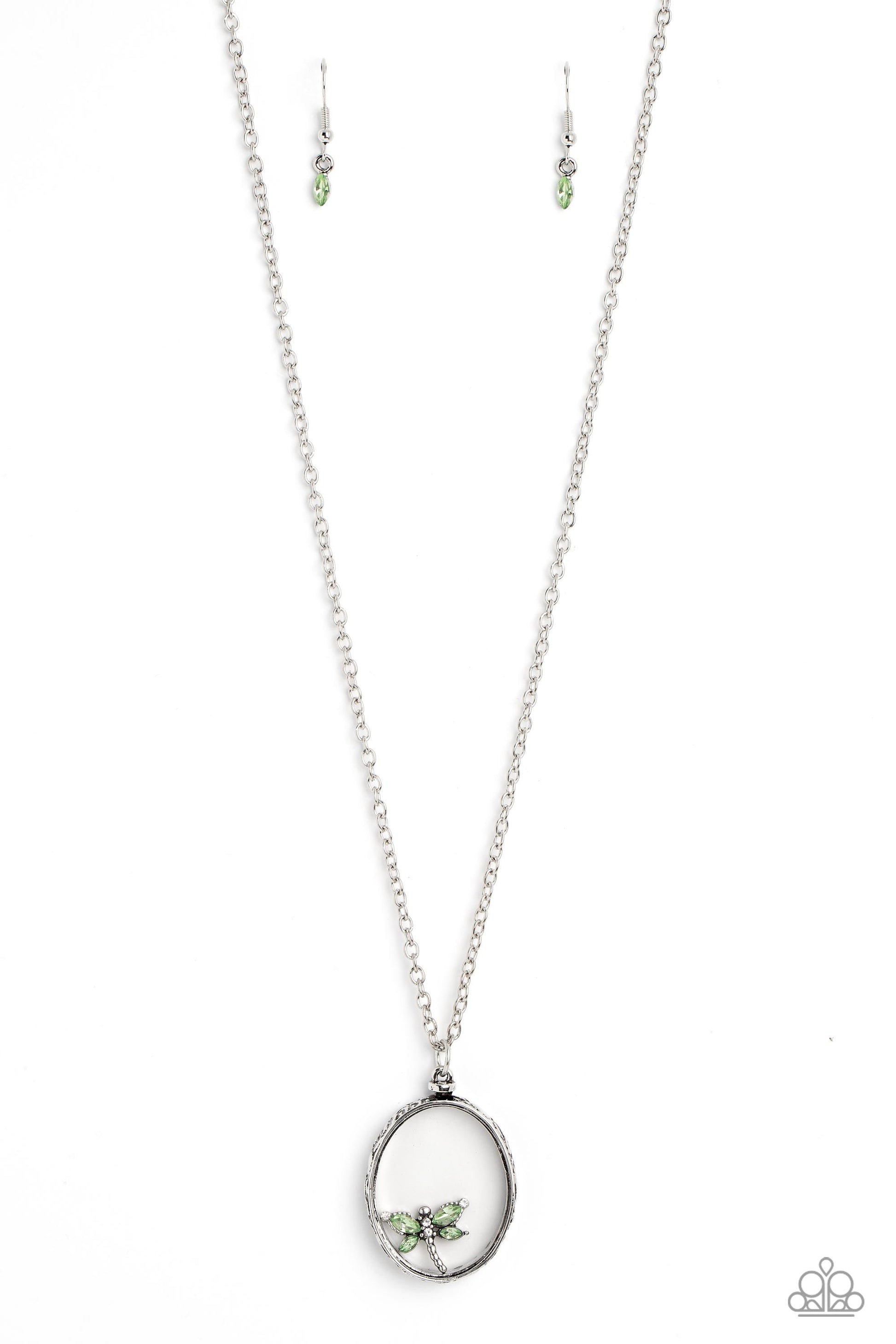 Falling from a high-sheen silver chain, a thick oval pendant with a faceted clear center lengthens the torso as it swings from the bottom of the chain. Swinging from the center of the shimmery pendant, an intricate dragonfly charm, lined with dainty green and white rhinestones creates additional eye-catching movement. Silver filigree and a dot motif border around the oval design creating whimsical cutouts for an elegantly earthy finish. Features an adjustable clasp closure.