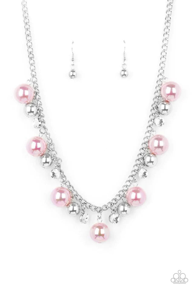 An oversized collection of shiny silver beads, white rhinestone accents, and pink iridescent pearls dangle from a classic silver chain, creating a stellar fringe below the collar. Features an adjustable clasp closure.