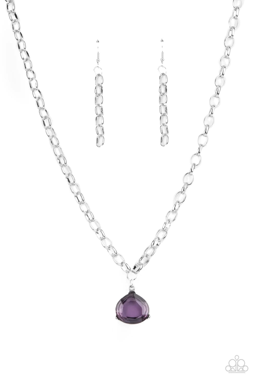 An oversized glassy purple gem is pressed into a pronged silver fitting at the bottom of a chunky silver chain, creating a dramatic pendant below the collar. Features an adjustable clasp closure.