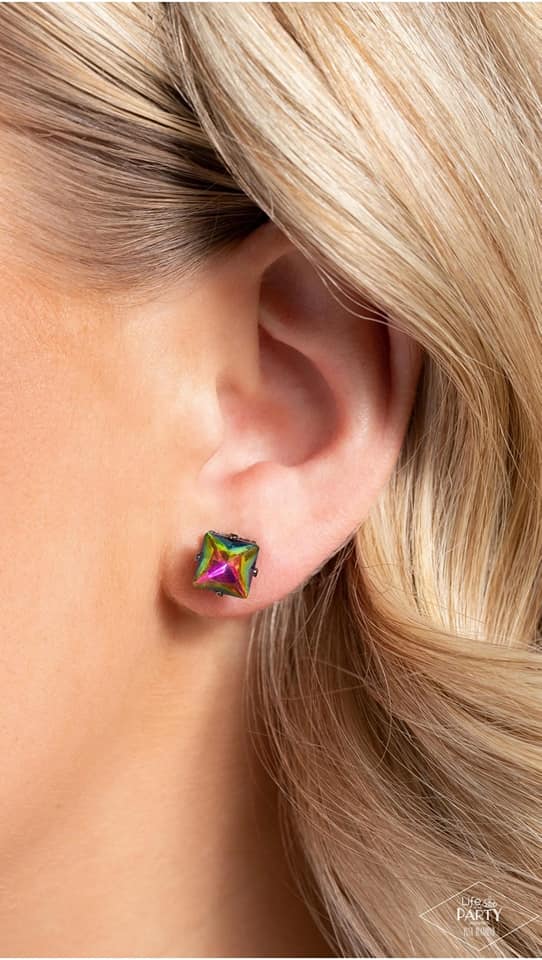 Featuring a regal prism style cut, a glittery oil spill rhinestone is pressed into a pronged gunmetal frame, creating the illusion of a floating gem. Earring attaches to a standard post fitting. Sold as one pair of post earrings. This Pink Diamond Encore is back in the spotlight at the request of our 2022 Life of the Party member with Pink Diamond Access, Cami