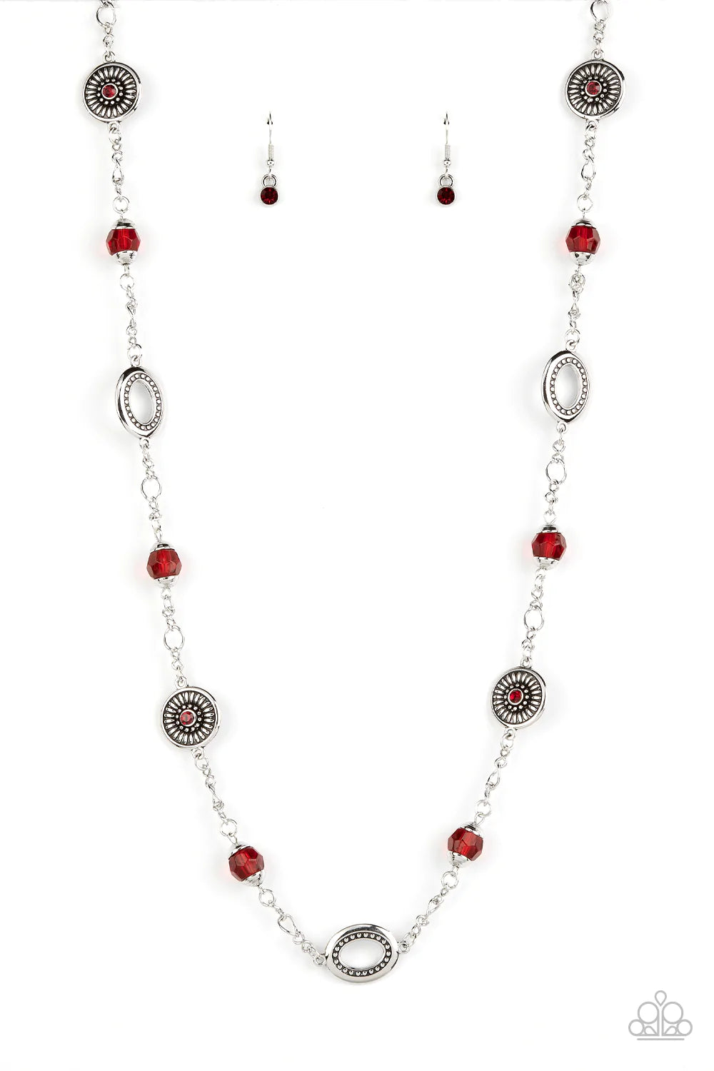 Faceted red beads capped in silver accents and antiqued silver medallions dotted with red rhinestone centers and radiating texture alternate with sections of silver chain creating a charismatic allure across the chest. Features an adjustable clasp closure.