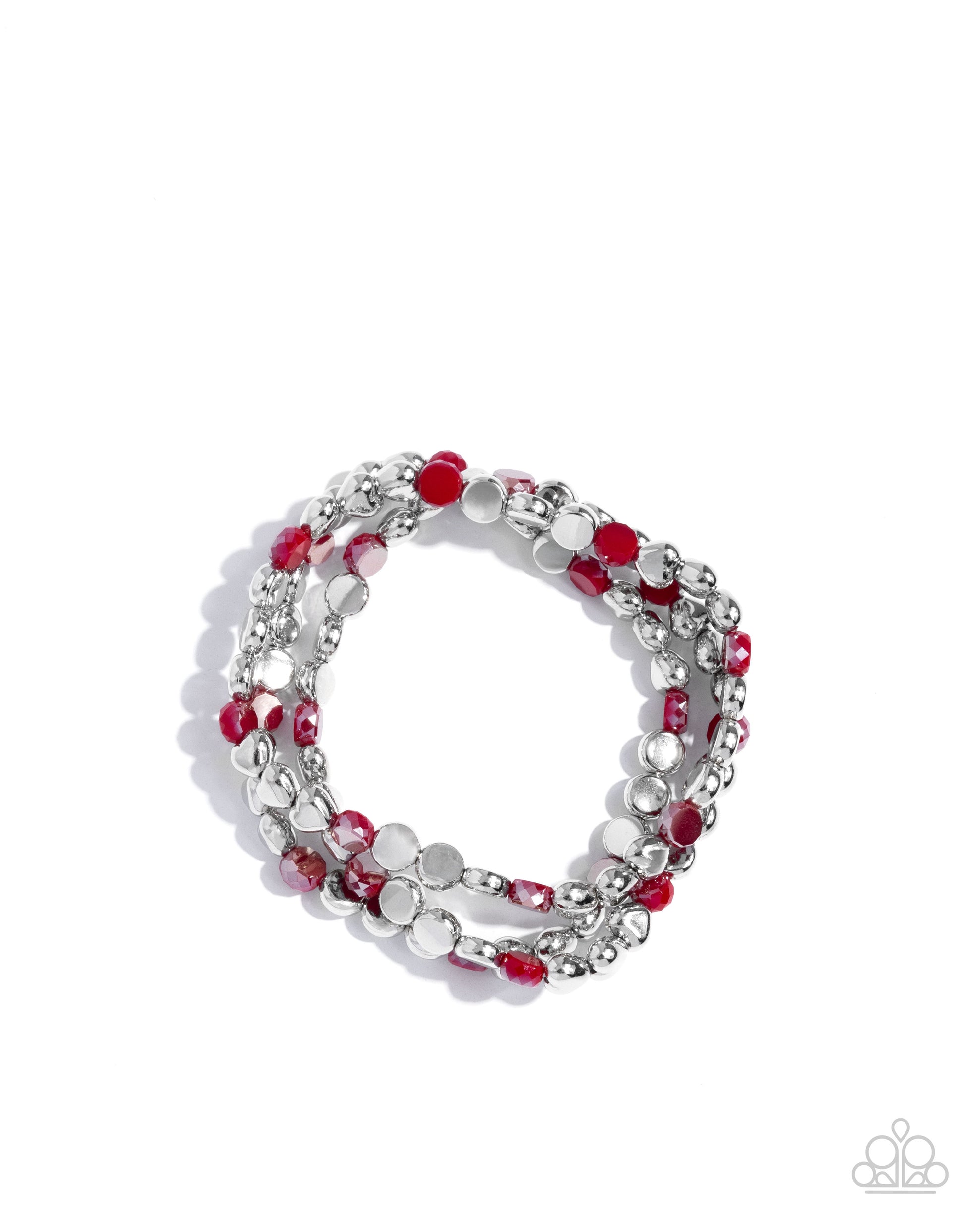 Threaded along stretchy bands, a delicate mix of faceted, smooth, and clear silver beads mix with dainty silver hearts and red iridescent beads as they layer around the wrist. The reflective surfaces add a subtle shimmer, perfect for elevating any look.