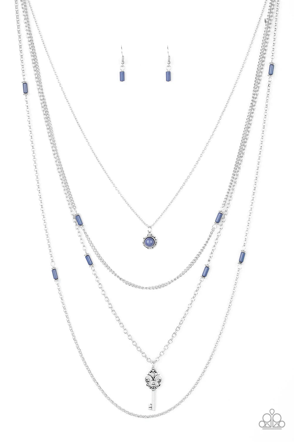 Featuring shiny blue and dainty silver accents, a blue beaded pendant gives way to a shimmery silver key for a whimsically layered look. Features an adjustable clasp closure.