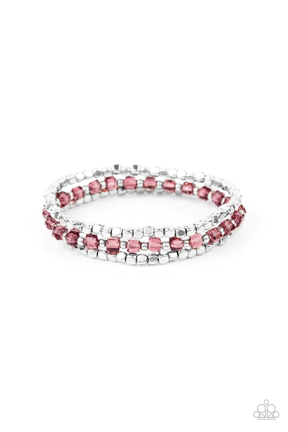 Separated by dainty silver beads, a sparkly strand of square purple crystal-like beads joins a pair of silver cube beaded stretchy bands around the wrist for a colorful look.