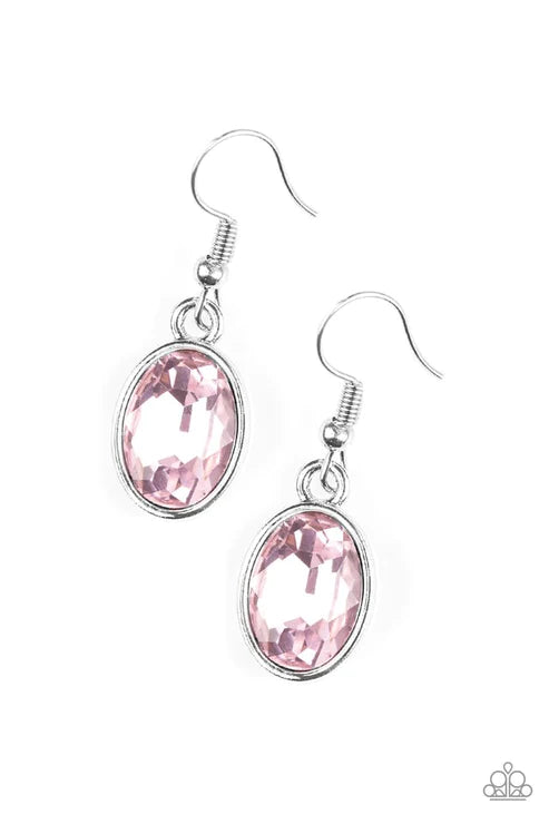 A faceted pink gem is pressed into a sleek silver frame for a timeless fashion. Earring attaches to a standard fishhook fitting. Sold as one pair of earrings.