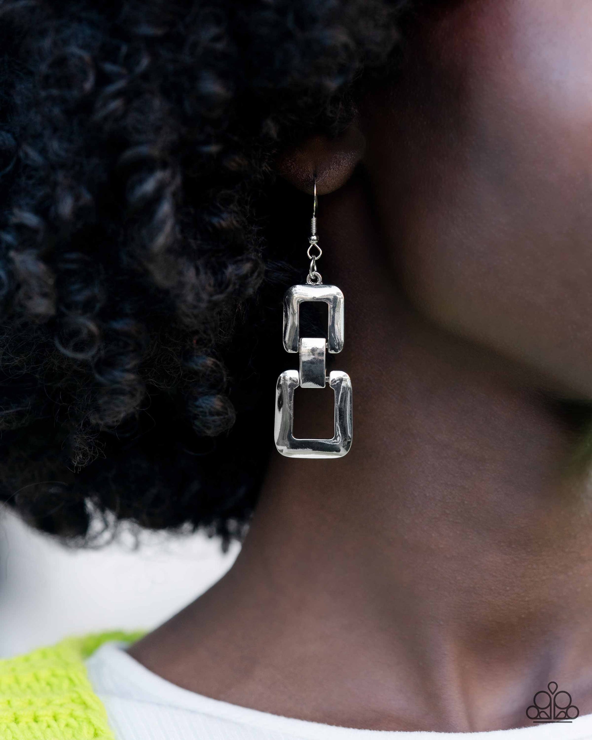 Brushed in an antiqued finish, two square silver frames link into a monochromatic lure for a rustic flair. Earring attaches to a standard fishhook fitting.