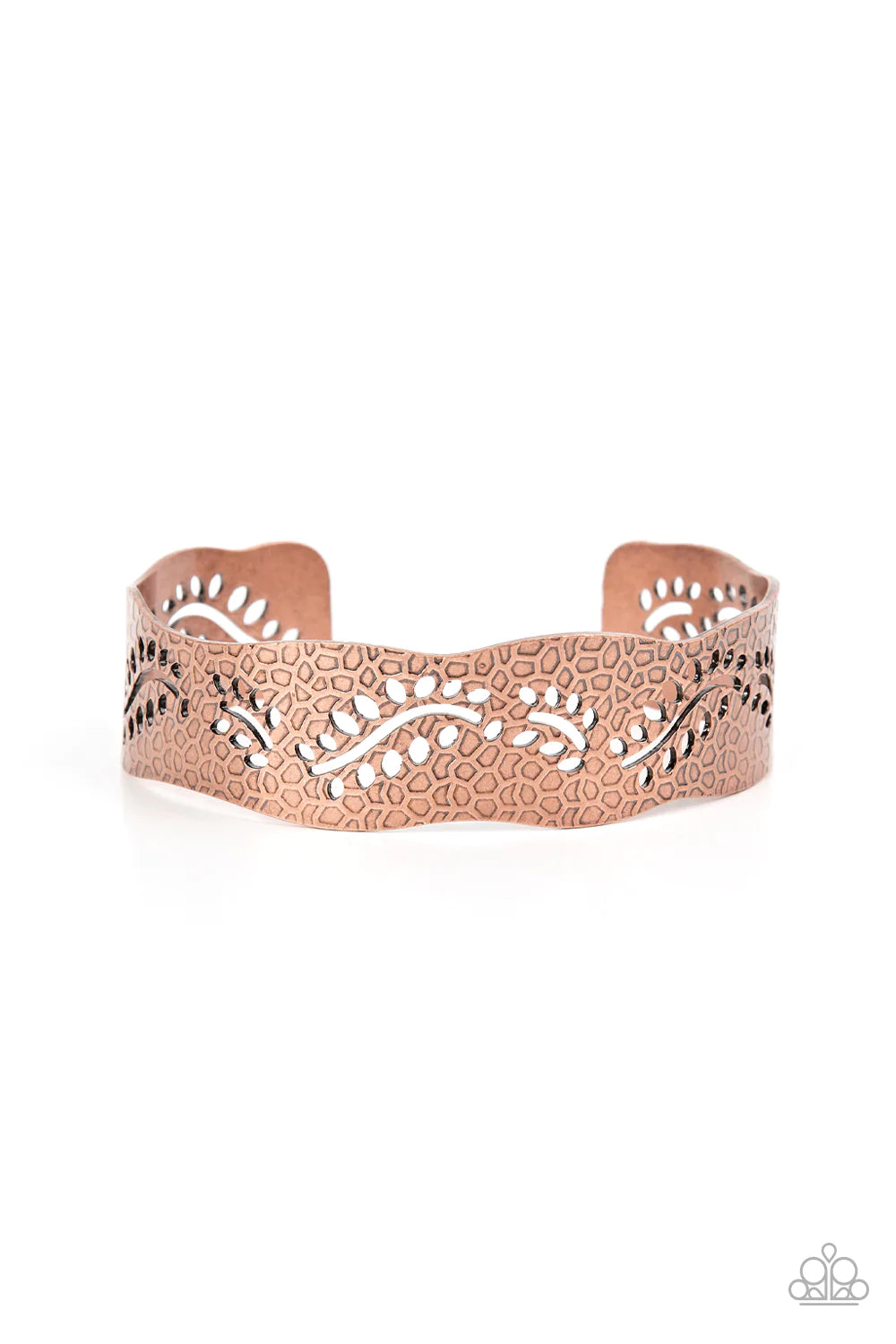 A wavy copper cuff is rustically embossed in an abstract honeycomb texture and stenciled in airy leafy patterns, resulting in a seasonal centerpiece around the wrist.
