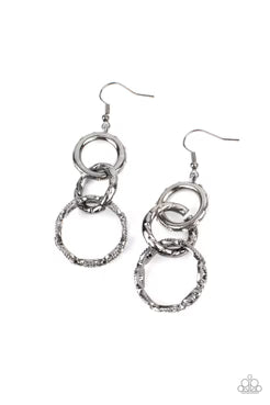 Featuring white rhinestones, twisted finishes, and chain-like patterns, an edgy collection of mismatched gunmetal rings delicately link into a glamorously gritty lure. Earring attaches to a standard fishhook fitting.
