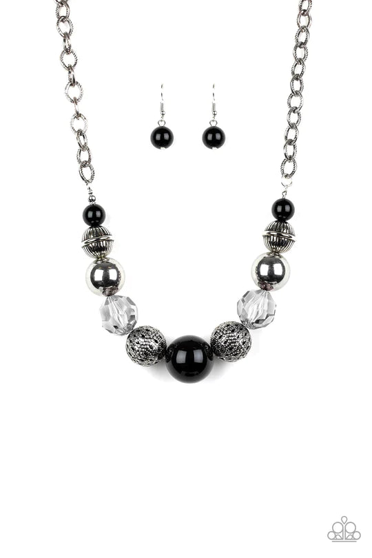 A collection of antiqued silver beads, smoky crystal-like beads, and oversized black beads are threaded along an invisible wire below the collar. Textured in linear patterns, an antiqued silver chain attaches to the colorful compilation for a statement-making finish. Features an adjustable clasp closure.
