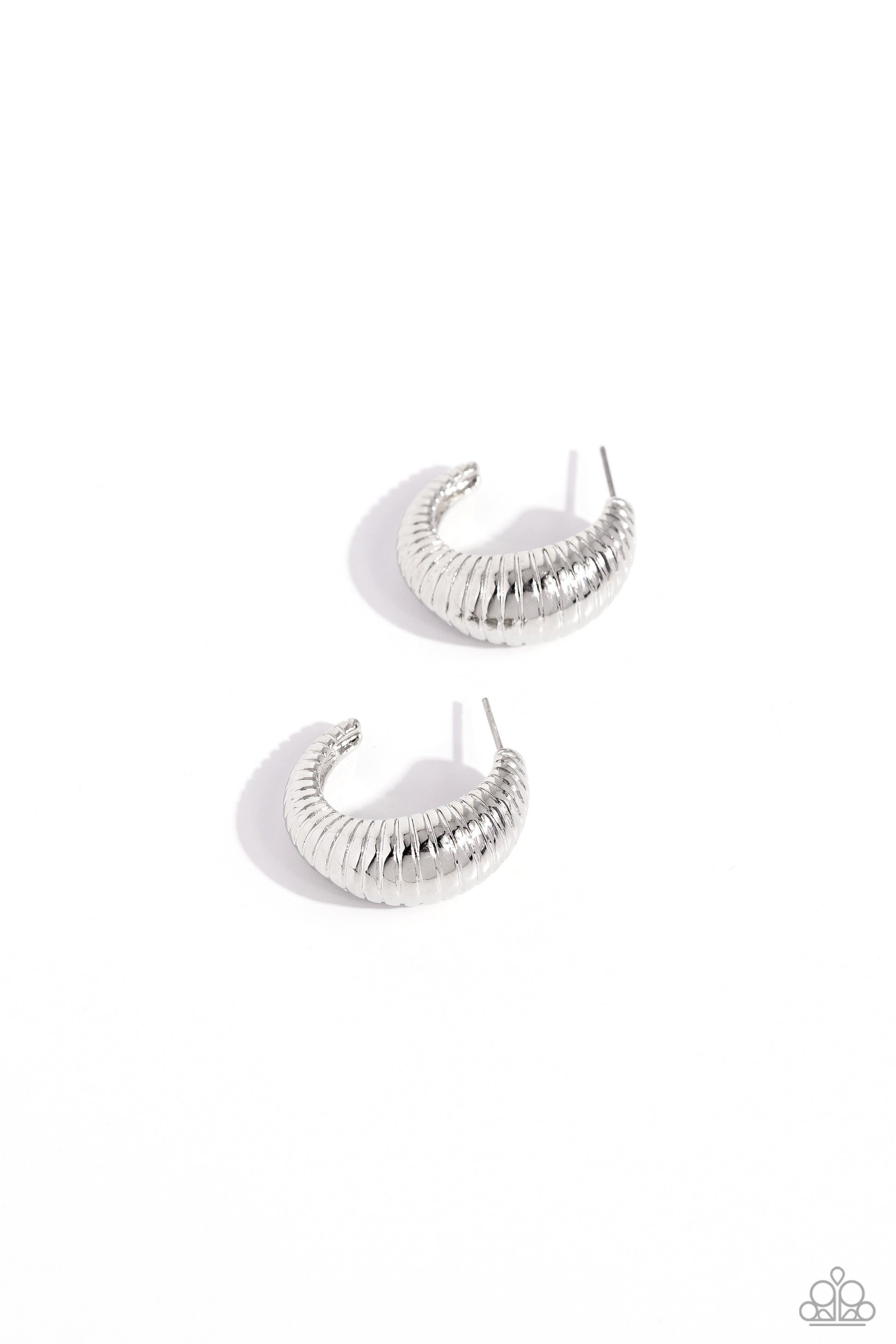 Featuring a beveled surface, a thick textured silver frame curves into a single hoop, creating an attention-grabbing shimmer. Earring attaches to a standard post fitting. Hoop measures approximately 3/4" in diameter.