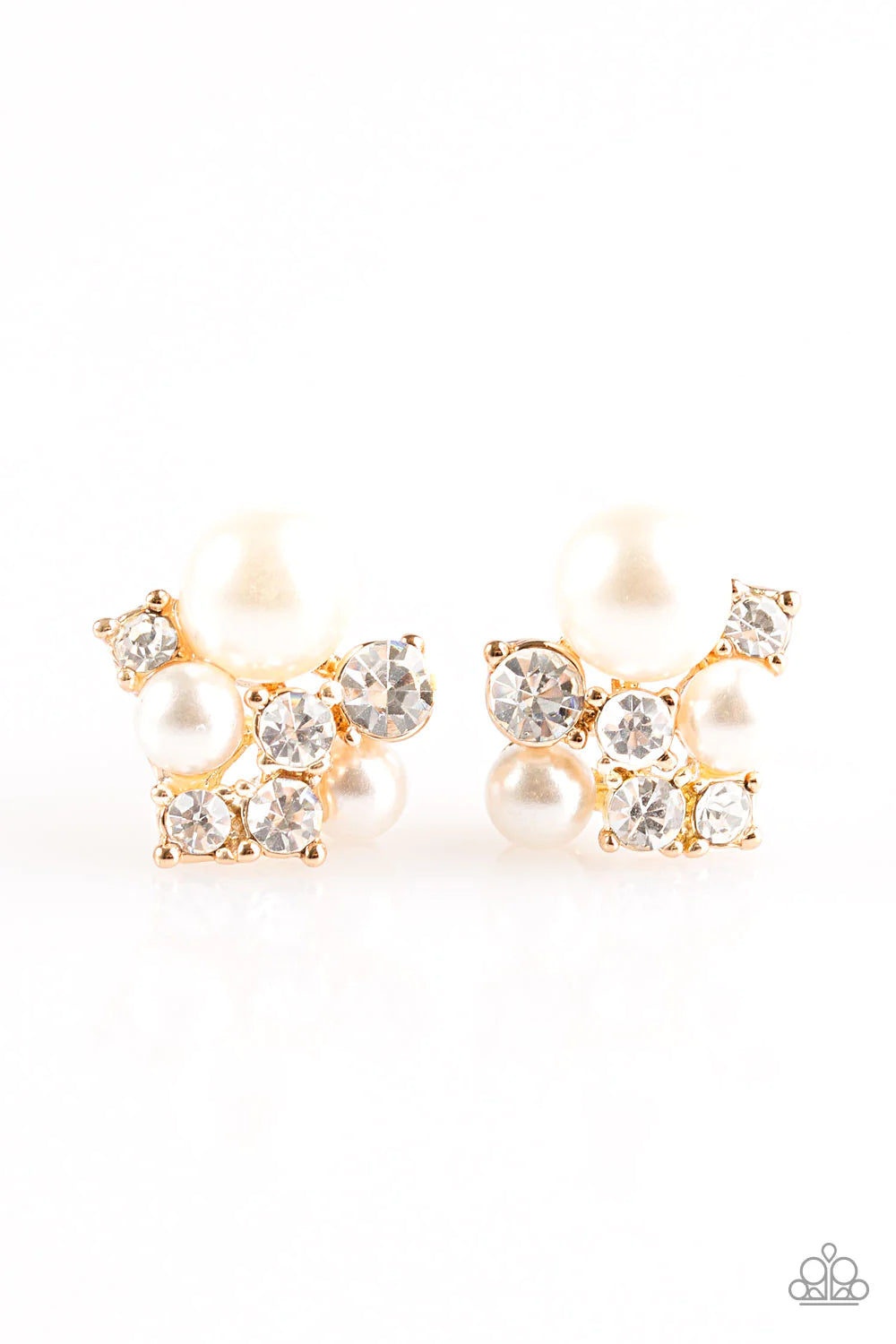 A beautiful cluster of white pearls and glittery white rhinestones coalesce into a sparkling bouquet. Earring attaches to a standard post fitting.