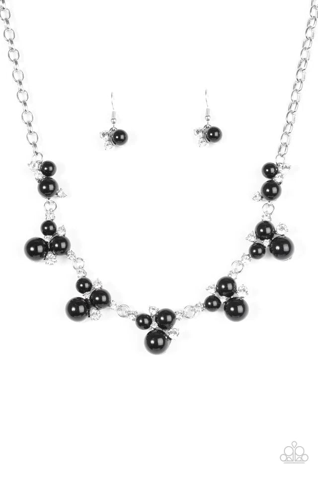Clusters of black beads and dazzling white rhinestones join below the collar, creating refined frames. Infused with a glistening silver chain, the sections of luminescent frames trickle along the neck in a timeless fashion. Features an adjustable clasp closure. Sold as one individual necklace. Includes one pair of matching earrings.