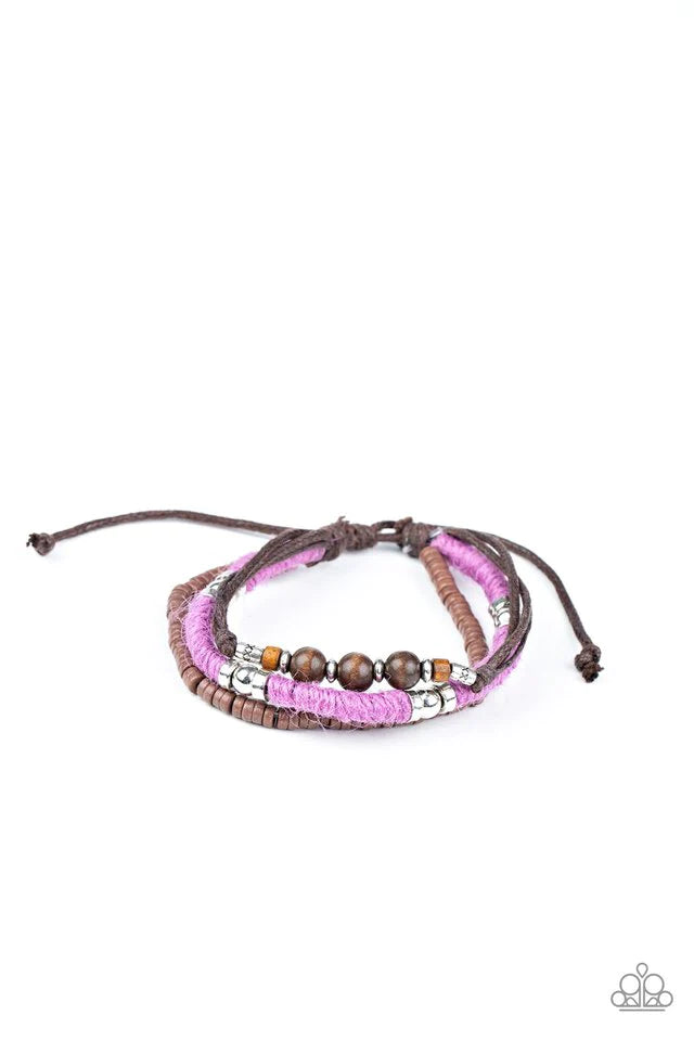 Infused with wooden and silver accents, mismatched strands of purple twine and brown cording layer around the wrist for a colorfully seasonal look. Features an adjustable sliding knot closure.
