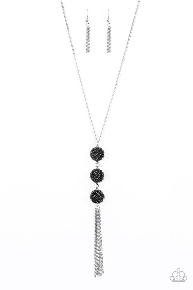Sprinkled in glittery black prism style rhinestones, three sparkling silver frames trickle down the chest. A shimmery silver tassel swings from the bottom of the triple stacked pendant for a glamorous finish. Features an adjustable clasp closure. Sold as one individual necklace. Includes one pair of matching earrings.